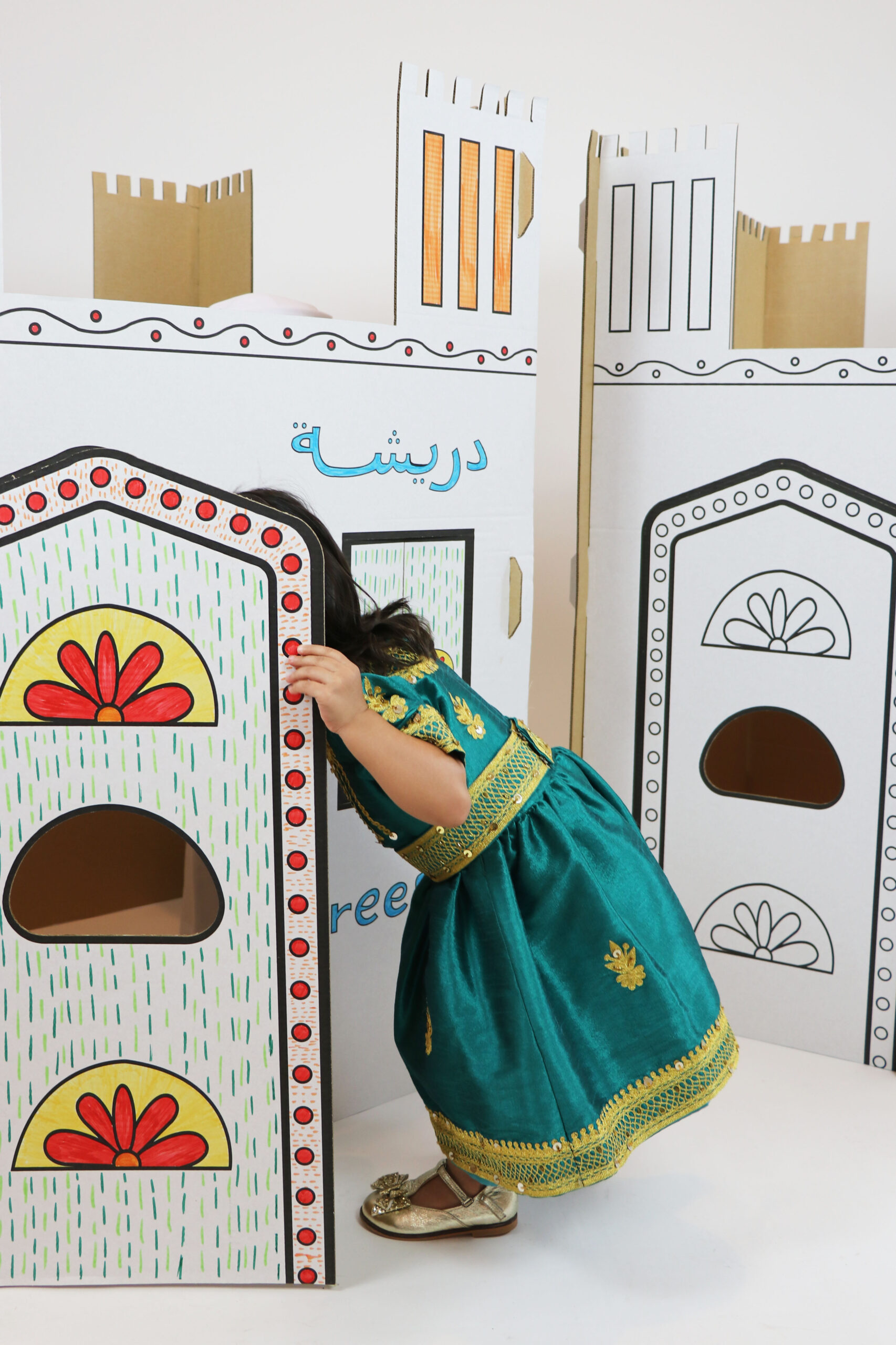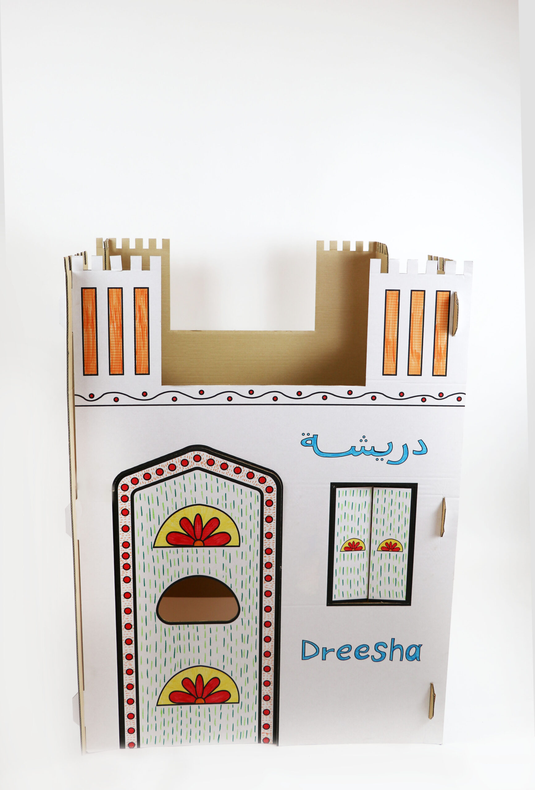 An eco-friendly carboard UAE traditional house. UAE houses in the past were sustainably designed and especially made to allow cooling within without the need for air conditioning. This structure gives you a glimpse of the past and makes for a fun playhouse. Comes with a free set of water colors.
